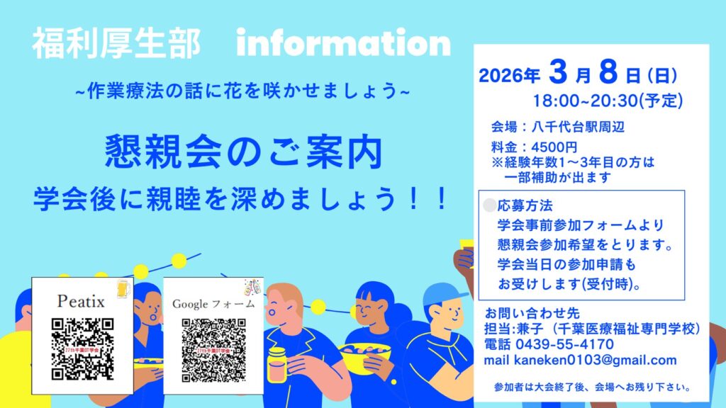 福利厚生部では、学会終了後に会員同士の交流を目的とした懇親会を開催いたします。